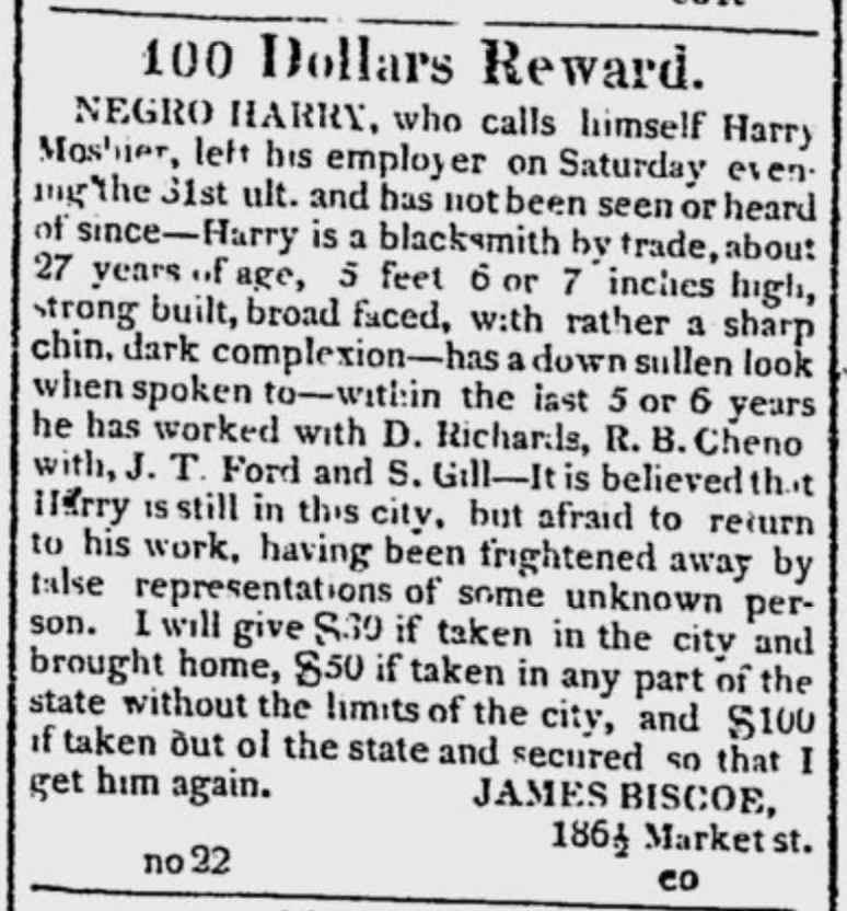 NEGRO HARRY, who calls himself Harry Moshier, left his employer on Saturday evening the 31st ult. and has not been seen or heard of since—Harry is a blacksmith by trade, about 27 years of age, 5 feet 6 or 7 inches high, strong built, broad faced, with rather a sharp chin, dark complexion—has a down sullen look when spoken to—within the last 5 or 6 years he has worked with D. Richards, R. B. Chenowith, J. T. Ford and S. Gill—It is believed that Harry is still in this city, but afraid to return to his work, having been frightened away by false representations of some unknown person. I will give $30 if taken in the city and brought home, $50 if taken in any part of the state without the limits of the city, and $100 if taken out of the state and secured so that I get him again.